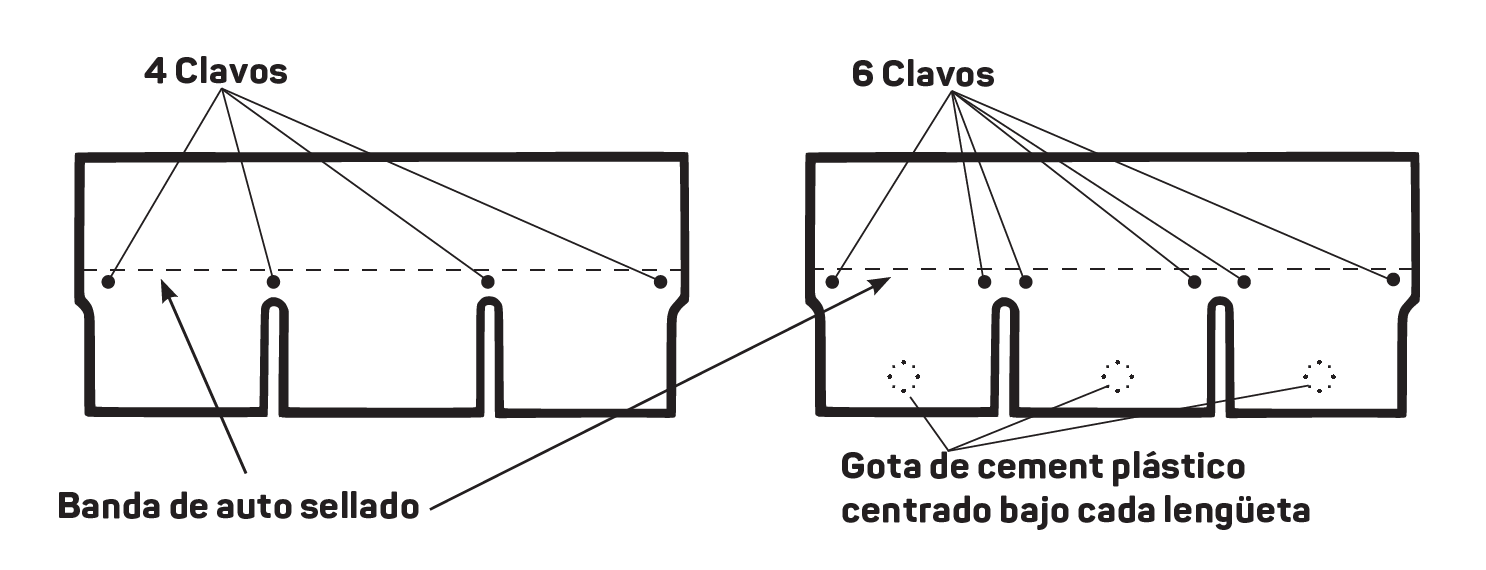 Martille por teja 4 clavos tachuelones galvanizados de 25 mm – 1” de largo y con cabeza plana y de 9 – 10 mm de diámetro. Clave los clavos debajo de la hilera de auto sellado, a 2.5 cm de cada borde y los dos clavos adicionales encima de cada corte que forma las lengüetas y debajo de la hilera de auto sellado.