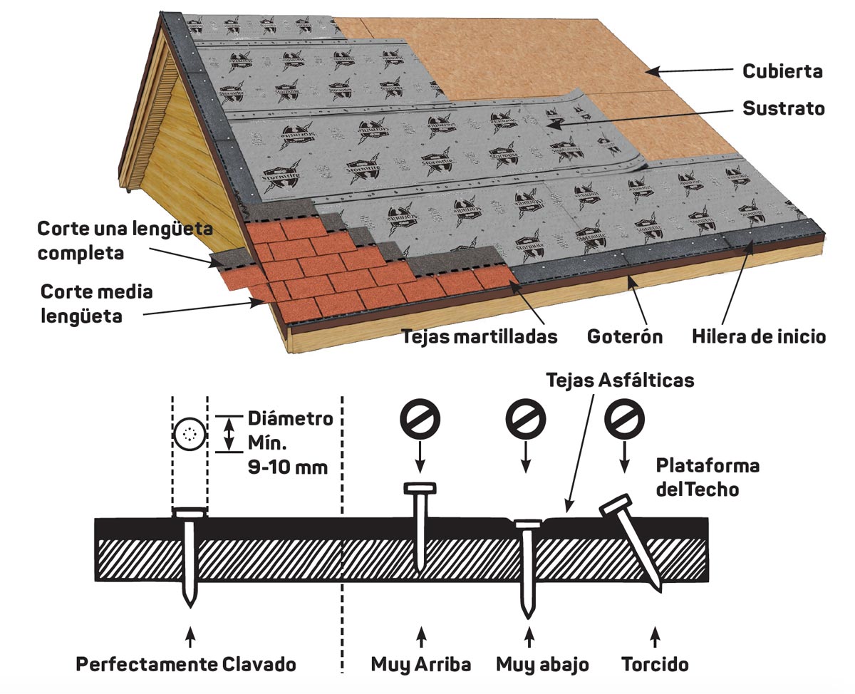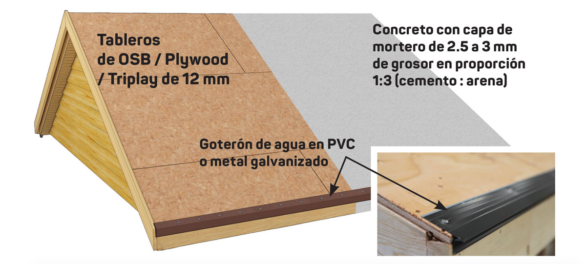 Asegurarse de que la cubierta de concreto o cubierta de madera estén limpias y libres de polvo. En la cubierta de concreto debe aplicar una capa de mortero de 2,5 a 3 mm de grosor en proporción 1:3 (cemento : arena). Para los tableros de OSB o Plywood /Triplay de 12 mm o ½ – deben estar secos, parejos y lisos. Siga las instrucciones del fabricante de los tableros de madera respecto al clavado y distancia entre apoyos. Así como el nivel de humedad recomendado antes de la instalación de las tejas asfálticas.