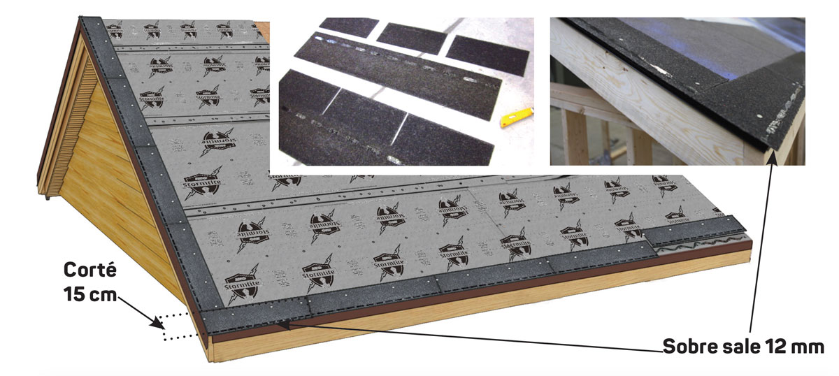 La primera hilera de inicio debe cortarla 15 cm de un lado para garantizar que las juntas de la hilera de inicio no se correspondan con las juntas de las tejas asfálticas. Igualmente debe sobresalir 12 mm o ½ del borde de la madera o del goterón de agua.