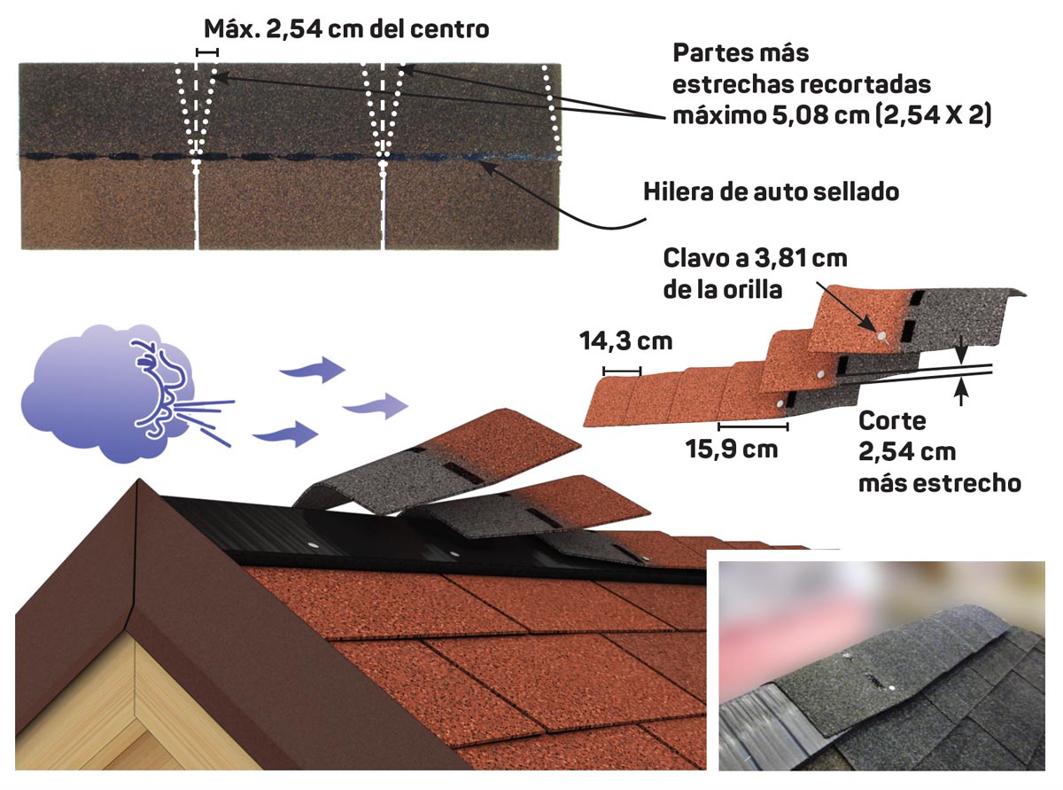 El corte en diagonal es para evitar que sobresalga al traslaparla con la siguiente cumbrera, el corte en diagonal no debe ser de mas de 2.5 cm (1”) a cada lado, para garantizar que al martillar la cumbrera a 3.81 cm (1 ½”) del borde está clavando también la parte superior de la cumbrera que está debajo.