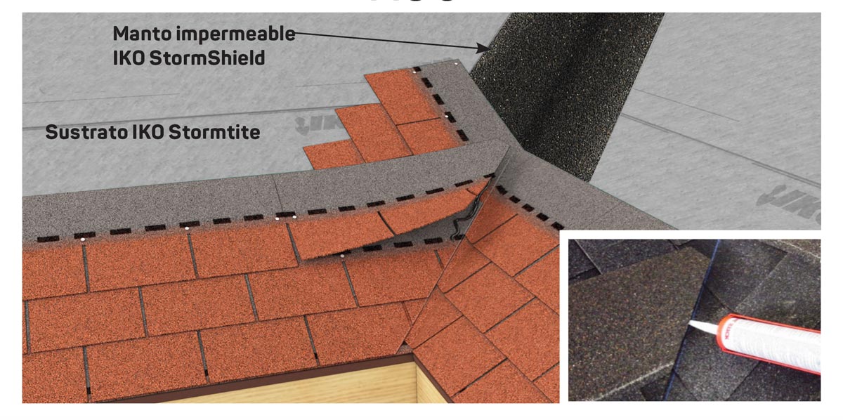 Sobre madera: Debe aplicar un Fieltro Asfáltico #15 o Fieltro sintético como el Stormtite® de IKO, extendiéndolo sobre todo el alero del techo al de forma horizontal traslapando 5 cm entre cada rollo de forma horizontal y entre principio y fin de cada rollo una sobre posición vertical de 10 cm. En pendientes bajas entre 9.5 grados y 18 grados (17% a 33%) tiene 3 opciones: 1) aplicar doble capa de Fieltro sintético, 2) usar la membrana impermeable auto adherible IKO StormShield con una sobre posición de 10 cm horizontal y verticalmente, y 3) impermeabilizar con una membrana asfáltica en rollo con base arena.