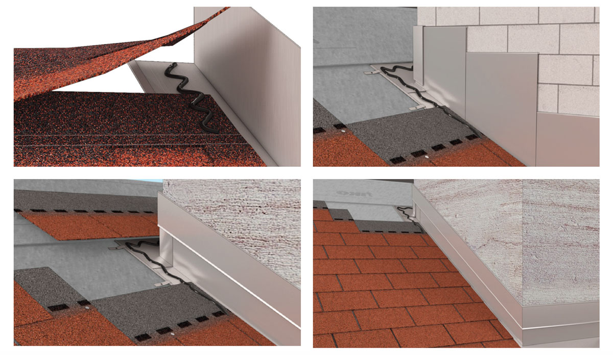 Se recomienda usar flanche y contraflanche cuando termina en alguna pared el techo. El flanche de metal galvanizado se martilla a la cubierta y se deja suelto sobre la pared , luego se aplica una tira de cemento plástico y se pone la teja encima. El contra flanche se fija entre los ladrillos de la pared y se deja suelto sobre la pared vertical, esto garantiza que los flanches y contra flanches no se dañen cuando la chimenea y el techo se muevan independientemente.