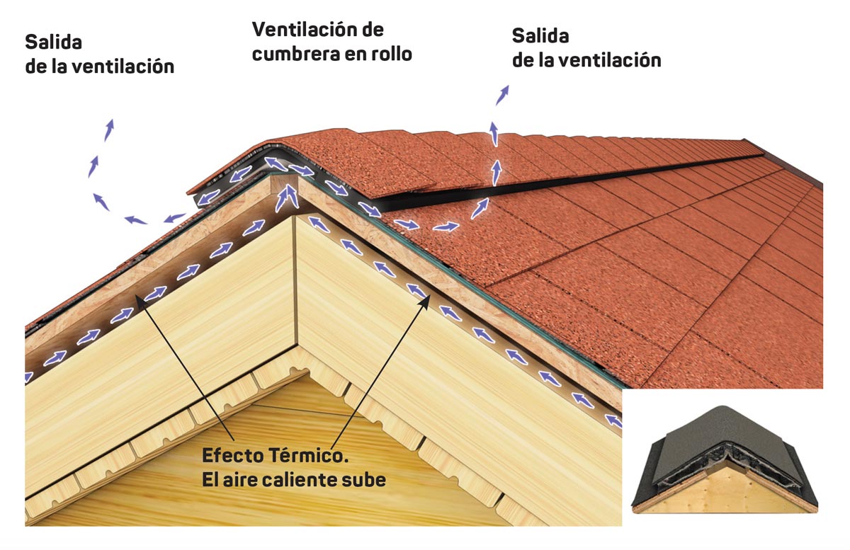 Es indispensable tener una adecuada ventilación que permita al aire circular libremente por debajo de la cubierta de madera removiendo el aire caliente y el vapor del agua, antes que llegue la noche y con el frió se condense, y dicha humedad sea absorbidas por la madera y la pudra. Un sistema eficiente debe tener una entrada de aire en los aleros o muy cerca a los aleros y una salida de aire en la cumbrera o muy cerca a la cumbrera que permita un flujo continuo de aire fresco que remueva el aire caliente, el vapor y la humedad. El 50% de la capacidad de ventilación debe ir en los aleros y el 50% restante en la cumbre o muy cerca de ella. Un sistema adecuado balanceado y acorde al tamaño del techo puede reducir la temperatura interna de la casa en hasta 5 grados centígrados. Por cada 150 metros cuadrados de piso de ático se requiere evacuar 1 metro cuadrado de aire. Consulte las instrucciones de instalación del fabricante de la ventilación o la guía de IKO sobre calculo e instalación de ventilación.