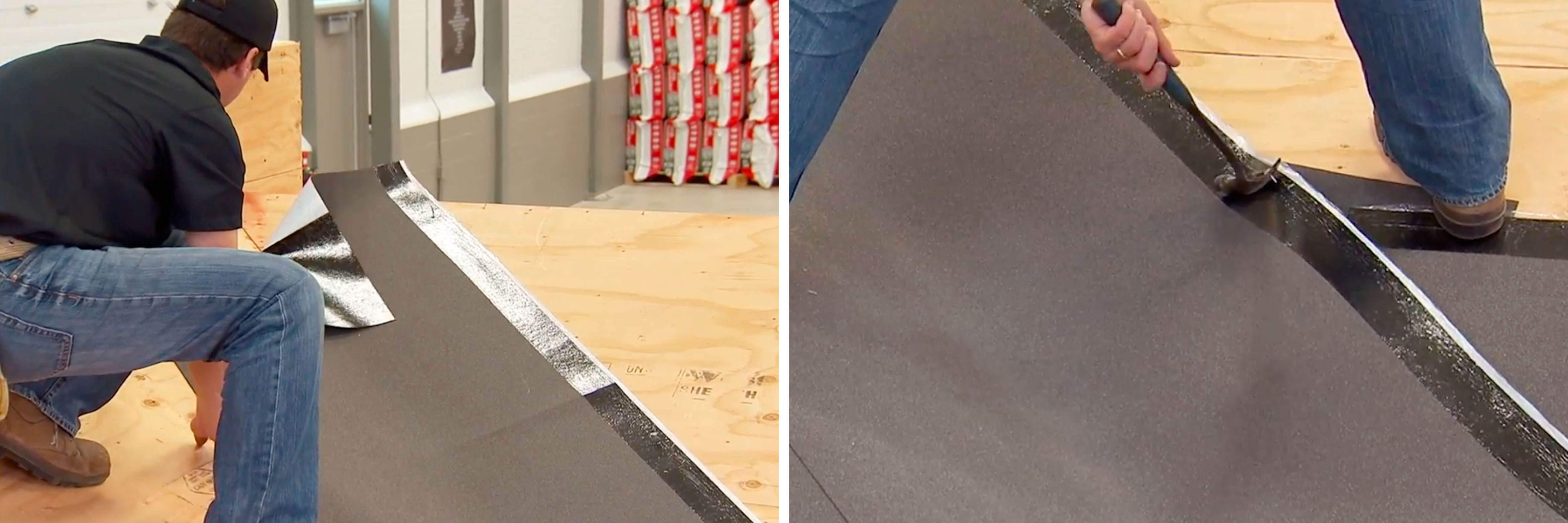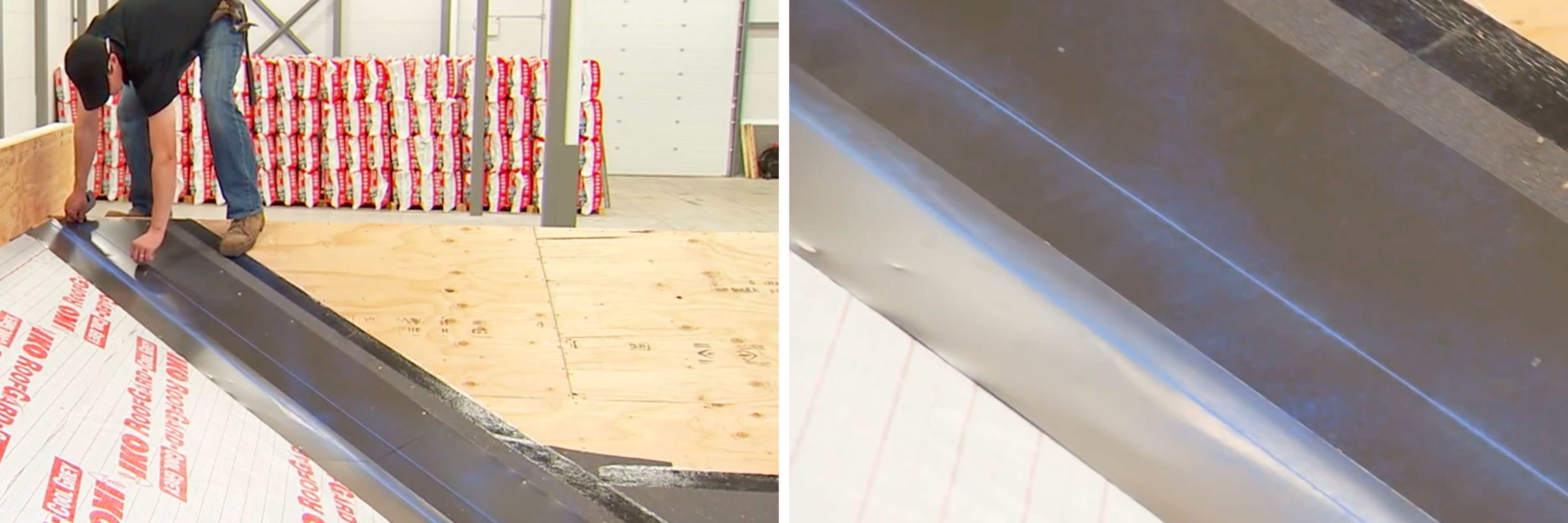 Para iniciar con el techado de las limahoyas abiertas, debe colocar un recubrimiento o membrana protectora antes de instalar las tejas asfálticas para darle una doble protección contra el agua en esa zona. En una superficie de madera, puede ser la membrana con una película auto-adherente StormShield de IKO y en una superficie de concreto puede colocar un impermeabilizante prefabricado en rollo (acabado arenado).