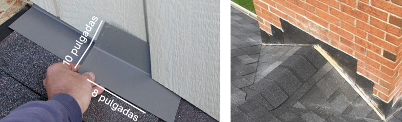 Para estos espacios vamos a ocupar tapajuntas o guardaguas, que son piezas usualmente de lámina galvanizada diseñados con el fin de alejar el agua de áreas críticas del techo que se terminen encontrando con superficies verticales como las chimeneas o paredes. Gracias al uso del tapajuntas el agua es redirigida hacia la teja asfáltica y no se filtra hacía la cubierta del techo.
