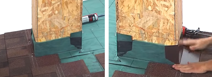 Una vez instalado el protector contra agua, es momento de empezar el proceso de cubierta con el método escalonado, colocando tapajuntas y después teja asfáltica como el resto de la chimenea.