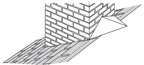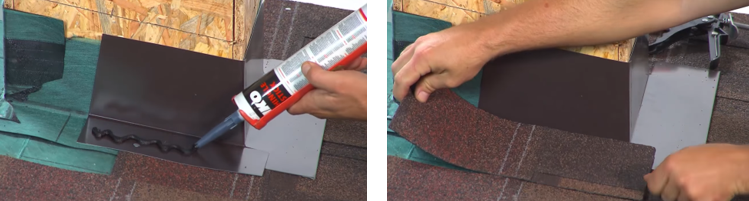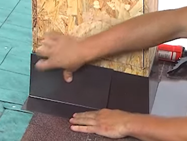 La pieza de tapajuntas debe ser clavada únicamente a la cubierta del techo, nunca a la pared vertical, ya que esto permitirá que las tapajuntas tengan espacio para moverse en cualquier expansión y contracción que pueda ocurrir entre la cubierta del techo y la chimenea o la pared. Ponga una línea de adhesivo asfáltico y coloque otra pieza de teja asfáltica encima.