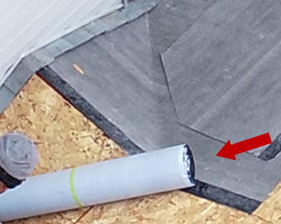 Llegó el momento de colocarlo, empieza cubriendo una pequeña parte de alrededor de la superficie vertical dela estructura de la chimenea con el fieltro sintético Stormtite. Continuamos en la parte inferior de la chimenea colocando una pieza de teja asfáltica y sobre ésta la primera pieza de tapajuntas como podemos ver en la imagen a continuación.