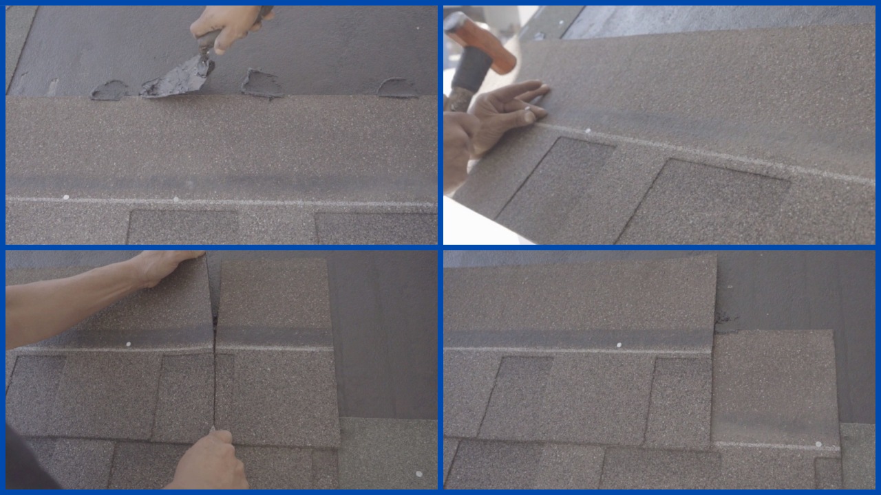 Llegó el momento de la teja asfáltica. La primera teja asfáltica se fija usando cemento asfáltico, aproximadamente 3 o 4pastas por pieza y 4 clavos de concreto a lo largo de la teja asfáltica o 6 clavos en caso de que sea una zona de vientos fuertes. Las siguientes filas de tejas asfálticas se dividen en tramos recortados de 10” de esta manera logramos traslapar las piezas escalonadamente, esto evitará filtraciones de agua entre las uniones de las mismas.