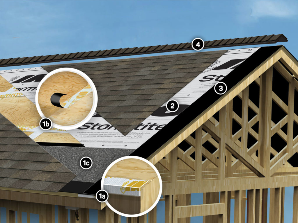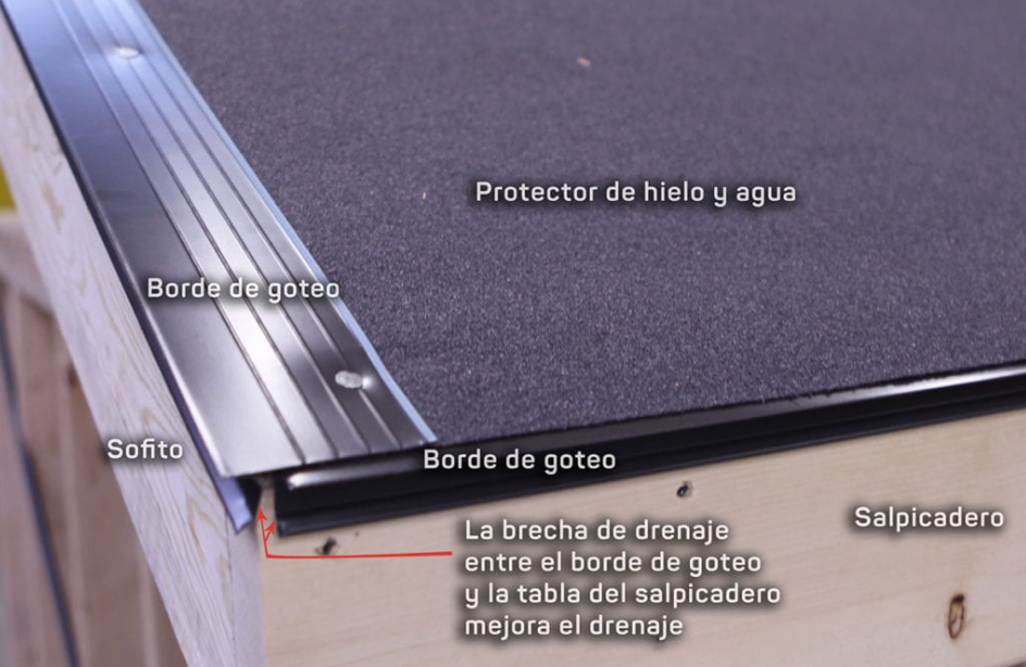Para lograr el máximo rendimiento tienes que incluir dos accesorios principales antes de la teja asfáltica: 1) los goterones en los bordes de la cubierta y 2) el recubrimiento, ya sea el recubrimiento sintético Stormtite o el protector contra agua y hielo Stormshield.